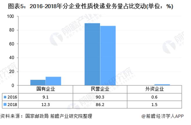 從企業(yè)性質來看,近年來民營企業(yè)快遞業(yè)務量占比有所下滑。2018年,民營企業(yè)快遞業(yè)務量占總快遞量的86.2%,較2016年下降4.1個百分點。國有企業(yè)及外資企業(yè)快遞業(yè)務量占比有所上升。
