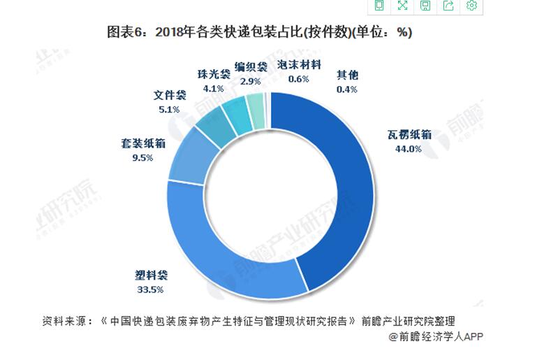 2019年,全國635.2億件快遞中,紙質包裝快遞占比約為58.6%(按2018年占比,包含瓦楞紙箱、文件袋、套裝紙箱),塑料包裝快遞占比約為41.1%(包含塑料袋、珠光袋、編織袋、泡沫材料),其它類型占比0.4%。
