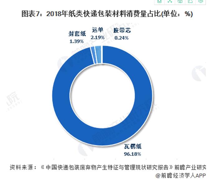 按照按照材質類型,可將快遞包裝材料分為紙質類和塑料類。2018年我國共消耗紙質類快遞包裝材料856.05萬噸,占快遞包裝材料的90.95%;塑料類包裝材料85.18萬噸,占快遞包裝材料的9.05%。