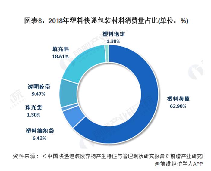 其中紙質包裝以瓦楞紙為主,占比高達96.18%;塑料類包裝材料主要包括塑料袋薄膜(不包括珠光袋和填充薄膜塑料)、編織袋、泡沫箱、珠光袋、膠帶和填充塑料等,其中普通塑料袋薄膜占比最高,質量占比達62.90%。對于快遞塑料袋薄膜,約占質量比例的80%是由廢料再生的,其廢棄物容易造成環(huán)境污染。