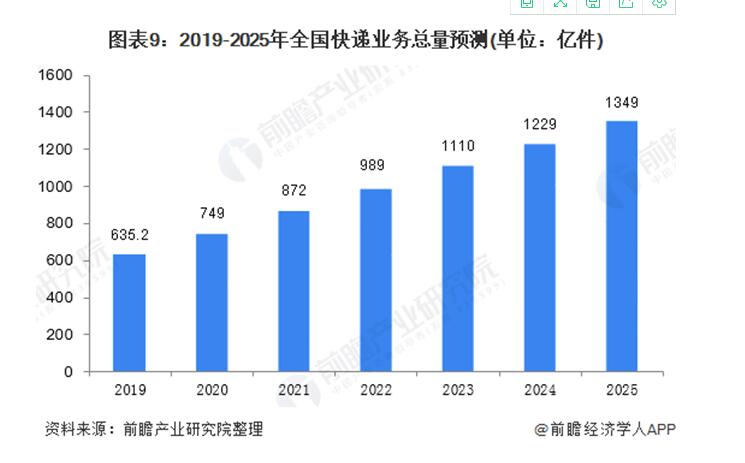 根據(jù)近幾年中國快遞業(yè)務量增速測算,到2025年,中國快遞業(yè)務量將達到1349億件,年復合增長率為13.4%。