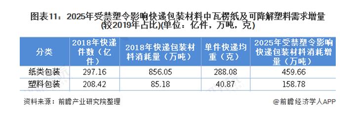 紙質包裝快遞中,瓦楞紙使用占比為96.18%,按單件紙質包裝快遞為288.08克,單件塑料包裝40.87克測算,2025年,受禁塑令影響,用于快遞包裝的瓦楞紙潛在需求增量為459.66萬噸,可降解塑料潛在需求增量為158.78萬噸。