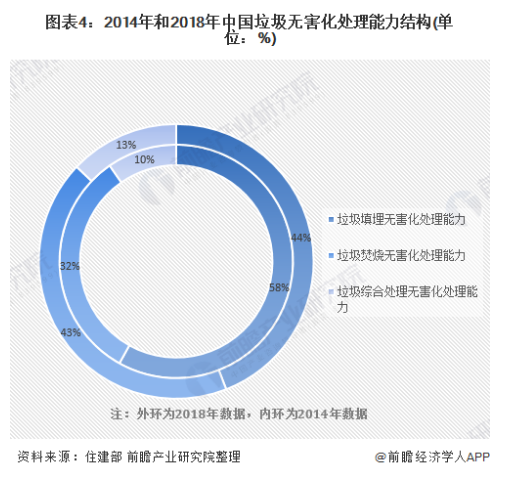 同樣的,2014-2018年4年間,我國垃圾焚燒無害化處理能力占垃圾無害化總處理能力的比例從32%增長到了43%,而垃圾填埋無害出處理能力的占比則從58%降到了44%?梢娊陙砝贌龑盥裉娲牧Χ戎蟆