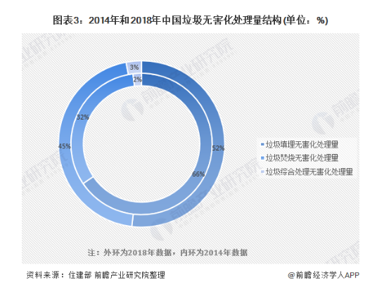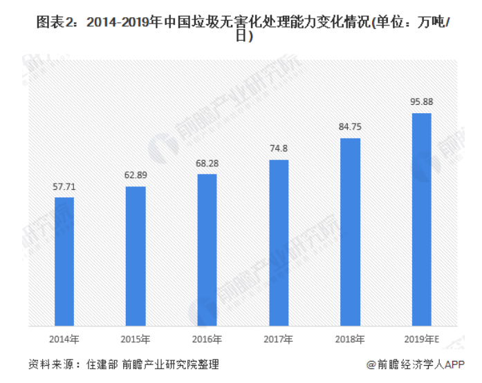 隨著環(huán)保政策的推動,我國的垃圾無害化處理問題也逐漸浮出了水面。根據住建部的統計數據,2014-2018年我國生活垃圾無害化處理量逐年增長,2018年我國生活垃圾無害化處理實現22562萬噸,其中垃圾填埋無害化處理11706萬噸;垃圾焚燒無害化處理10185萬噸;垃圾綜合處理無害化處理674萬噸。據前瞻產業(yè)研究院初步估計,2019年我國生活垃圾無害化處理量將達到24559萬噸。