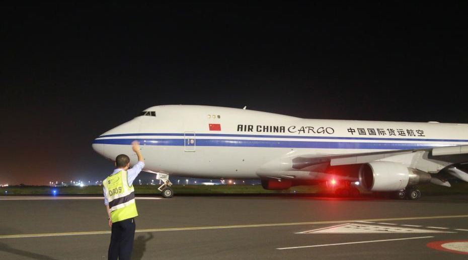 圖為當(dāng)?shù)貢r(shí)間2月4日晚,國(guó)航南非分公司總經(jīng)理胡正君與機(jī)場(chǎng)工作人員商議物資裝運(yùn)方案。