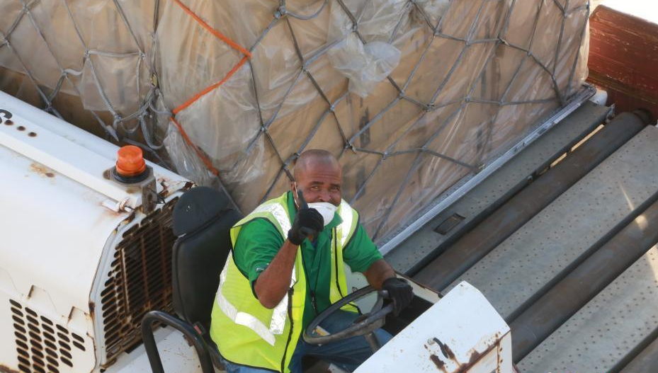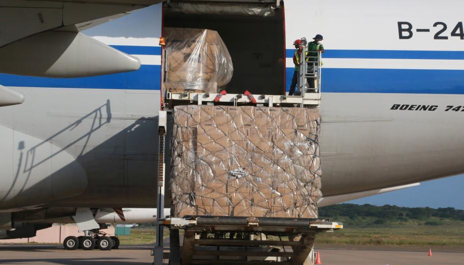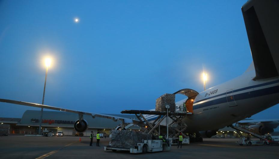 經(jīng)過(guò)24小時(shí)連續(xù)裝載作業(yè),中國(guó)國(guó)際航空公司貨運(yùn)專機(jī)CA1002于2月5日晚間從南非德班國(guó)際機(jī)場(chǎng)起飛。該架飛機(jī)共運(yùn)送7150箱共計(jì)286萬(wàn)只醫(yī)用防護(hù)口罩,用以支援中國(guó)抗擊新型冠狀病毒感染的肺炎疫情。圖為當(dāng)?shù)貢r(shí)間2月5日,工作人員利用機(jī)械設(shè)備將物資運(yùn)至貨艙。
