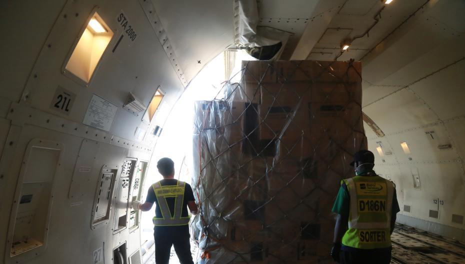 圖為當(dāng)?shù)貢r(shí)間2月5日,工作人員利用機(jī)械設(shè)備將物資運(yùn)至貨艙。