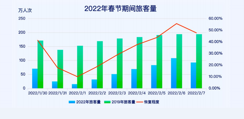 根據(jù)當(dāng)前機票預(yù)定情況與趨勢,春節(jié)假期1月30日至2月7日期間,旅客量預(yù)計將達(dá)到 540 萬,較2021年同期旅客量基本持平,是2019年同期旅客量的 34.79%。隨著局部地區(qū)疫情的暴發(fā),旅客出行規(guī)模將受到始發(fā)地與目的地當(dāng)?shù)匾咔榈挠绊憽?/p>