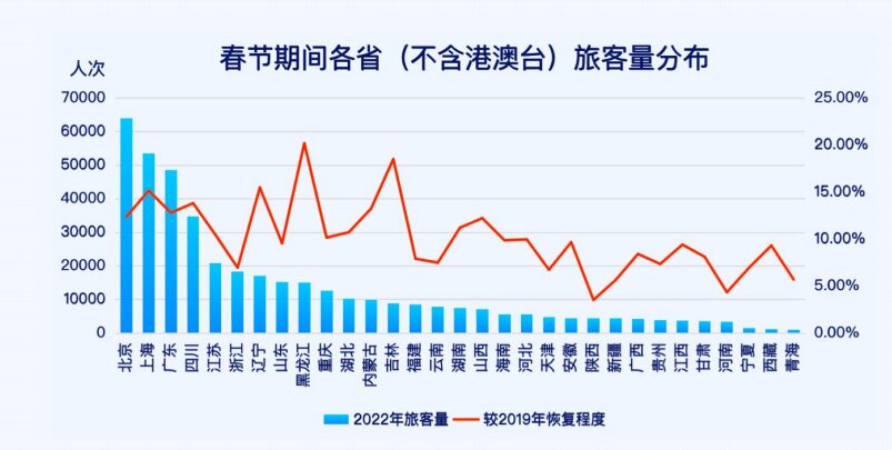 2022年春節(jié)期間,北京、上海、廣東、四川、江蘇、浙江、遼寧、山東、黑龍江、重慶的旅客量居全國前十。與2019年同期相比,陜西、河南、新疆維吾爾自治區(qū)、青海、天津、浙江、寧夏、貴州、云南等省份的旅客量下降最明顯。