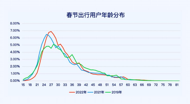 2022年春節(jié)期間購票人群更具有高集中度的特征。與2019年同期相比,今年購票旅客集中于25-35歲;與2021年同期相比,今年的旅客年齡分布水平整體右移,旅客的平均年齡有所上升。