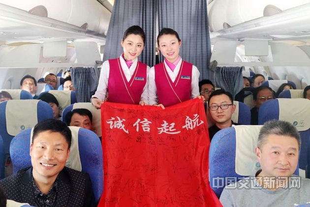 當天上午,乘務組完成服務后,拿出精心準備好的“誠信起航”的條幅,旅客們紛紛在上面簽下自己的名字,頓時紅色條幅在客艙里舞動,氣氛瞬時活躍起來。他們用簽名的方式維護消費者合法權益,支持南航陽光誠信的公眾形象。