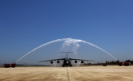 2016年7月6日,運-20飛機滑過水門接受洗禮,官兵用最隆重的儀式歡迎“鯤鵬”參軍入伍。劉暢/攝(資料照片)