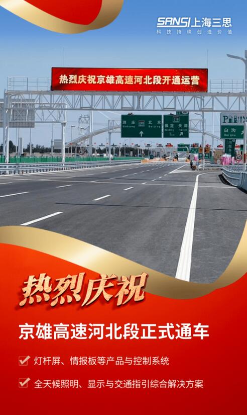 除創(chuàng)新功能的智慧燈桿外,京雄高速主線上所應(yīng)用到的LED陶瓷像素路燈、LED照明燈具、收費(fèi)站頂棚式情報(bào)板、LED可變限速標(biāo)志、門架式大型情報(bào)板、LED交通誘導(dǎo)屏等道路照明與智能交通類的LED設(shè)備及控制系統(tǒng),也是由上海三思研發(fā)供應(yīng),設(shè)備總數(shù)數(shù)萬(wàn)套(臺(tái)),形成一套涵蓋燈桿屏、情報(bào)板等產(chǎn)品與控制系統(tǒng)的、完整的全天候照明、顯示與交通指引綜合解決方案。