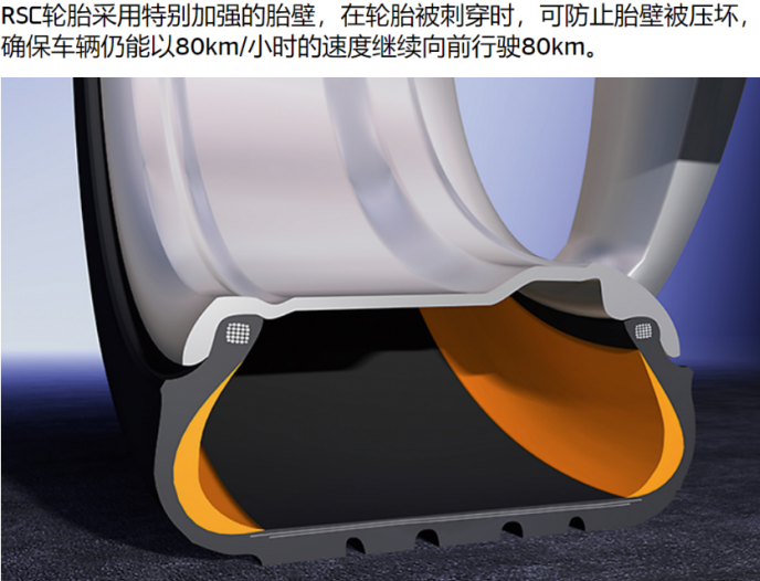 “缺氣保用輪胎”(英文縮寫RSC輪胎)的原理是依靠堅固的胎壁支撐泄氣后的輪胎,所以它帶來的副作用是舒適性降低,行駛中胎噪增大,以及輪胎自身更重,往往需要專用的輪輞配合等等。