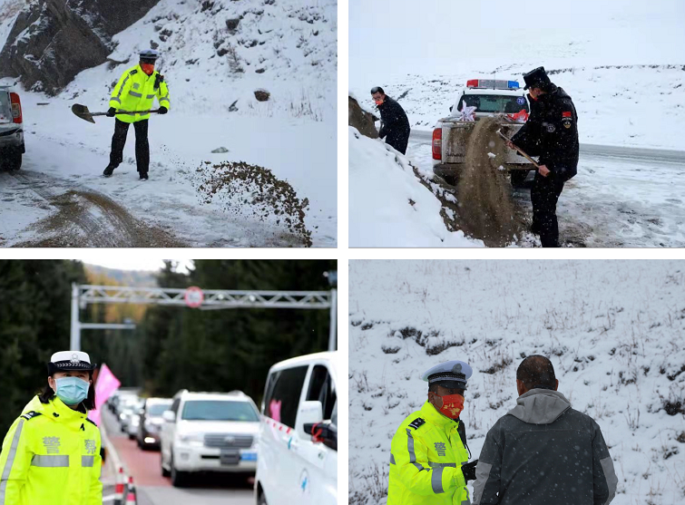 路因山回環(huán),山因路韻致;秋景繽紛美,冬雪入約至?{斯的路在山路間起起伏伏,彎彎轉(zhuǎn)轉(zhuǎn)。當(dāng)雪降臨,白雪勾勒山林,水墨意韻成畫,美不勝收。山路幽幽是美景,一場雪讓路面變得濕滑,也是安全隱患所在。10月5日上午,從凌晨3時起至11時,喀納斯景區(qū)公安局交警大隊民警王文已經(jīng)在S232線賈登峪至52公里執(zhí)勤點往返巡邏了4個來回,及時報送天氣情況及路況。當(dāng)雪越下越大,道路通行變差后,他立即投入到道路安全保障中,開始和戰(zhàn)友們一起在結(jié)冰路面拋灑防滑沙,時而去路面指揮疏導(dǎo),一邊指揮車輛,一邊向駕駛員叮囑冰雪路面注意事項。等到天氣轉(zhuǎn)晴,路面積雪融化,車輛可以暢行時,他又前往其他路段支援工作去了。雖然早餐和午餐都沒有吃東西,將近24小時沒有休息,但身為一名交警看著濕滑的路面,他仍然堅持在一線疏導(dǎo)交通。他是一個普普通通的人,也是一名平凡崗位上的人民警察,因為頭頂警徽,身著藏藍(lán),生命里就刻上了若牛重負(fù)的使命感,寢食難安的責(zé)任感。
