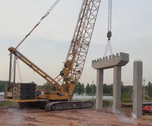 白玉河1號大橋預制蓋梁采用工廠預制、現(xiàn)場拼裝的施工工藝,具有工期短、風險低、節(jié)能環(huán)保、交通干擾小等特點。此次吊裝的部位為16號預制蓋梁,預制蓋梁結構尺寸長11.8米,寬2.2米,高1.6米,重103T,采用350T履帶吊車進行吊裝,吊裝精調(diào)完成后,通過預埋定位套筒分別與預制墩柱16-2號、16-3號墩進行注漿拼裝。
