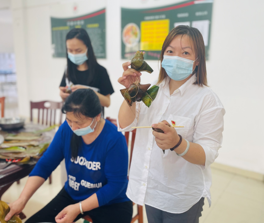 活動現(xiàn)場,清新粽香陣陣撲鼻,食堂大姐為我們提前準(zhǔn)備了花生米、紅豆、臘肉、棕葉等食材。大家圍在桌子前包著粽子,從折粽葉、裝糯米、到放餡料、裹扎繩,大家一邊聊著家常、一邊互相學(xué)習(xí)包粽子技巧、歡聲笑語、忙的不亦樂乎,不一會兒,一個個形態(tài)各異、飽含祝福的粽子就裝滿了臉盆,大家分享著各自的成功和喜悅。