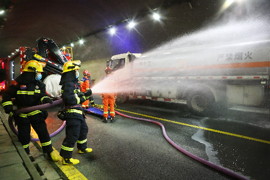上午9:00,演練正式開始。為了突出演練的實戰(zhàn)性,特別選定在通行環(huán)境復(fù)雜的特長隧道小三岔口隧道內(nèi)(全長4498米)進行。演練背景模擬G95小三岔口隧道(張家口方向)K883+585處,一輛運載;饭捃嚢l(fā)生事故起火,駕駛員重傷被困車內(nèi),押運員報警求助。