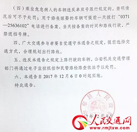(四)乘坐危急病人的車(chē)輛違反單雙號(hào)限行規(guī)定的,查明情況后可不予處罰;用于婚喪嫁娶的車(chē)輛可提前一天撥打“0371—25636102”電話進(jìn)行備案,當(dāng)天按備案的時(shí)間和路線行駛,嚴(yán)禁遮擋號(hào)牌。
