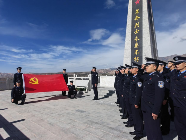 “我志愿加入中國共產(chǎn)黨,擁護黨的綱領......” 9月30日,博孜墩邊境派出所開展“祭英烈、憶初心”烈士紀念日活動,深切緬懷先烈不朽功績,全體民警在莊嚴的革命烈士紀念碑下,面對鮮紅的黨旗,右手握拳,莊嚴宣誓。