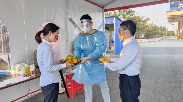在值班領(lǐng)導(dǎo)的帶領(lǐng)下為卡口一線疫情防控人員送去剛摘下的新鮮水果,為工作人員送上最溫暖的關(guān)心,提醒大家做好安全和自身防護工作,并為工作人員加油、鼓氣,同時詢問是否有需要幫助解決的問題,永興管理所將全力配合疫情防控工作。目前,正處于疫情防控的關(guān)鍵時刻,湖北交投江漢運營公司永興管理所將積極配合屬地疫情檢查工作,幫助講解正確查驗流程、疏導(dǎo)等待檢測車輛等,確保站口防疫檢測工作有序進行,站口安全暢通。我們始終與防疫人員團結(jié)一致,對外嚴防死守,堅決打贏這場疫情防控阻擊戰(zhàn)。(湖北交投江漢運營公司永興管理所 徐志蓬)