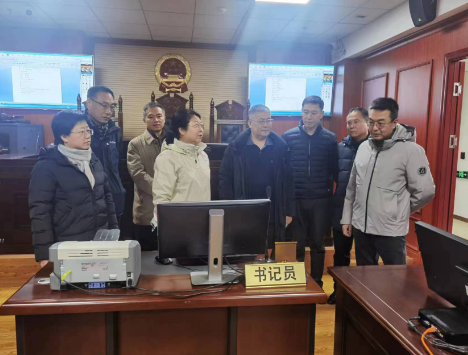 鄧妍一行詳細(xì)查看了自貿(mào)區(qū)法庭辦公區(qū)、審判法庭、智慧法院設(shè)備及法庭安保設(shè)施情況,鄧妍充分肯定了法庭前期的基本建設(shè),認(rèn)為,充分利用了有限空間,設(shè)計科學(xué)合理,施工質(zhì)量好效率高,信息化保障完備。