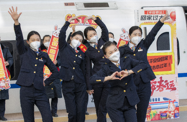 1月7日,在大連至吉林的G8009次列車的站臺上,大連客運段以“平安回家 歡喜過大年”為主題,為旅客準備了一系列的驚喜活動,為春運首日營造喜慶氛圍。旅客一下站臺,首先迎接他們的是“歡迎”區(qū):5名青春靚麗的連客青年用活力滿滿的舞蹈《新年快樂》和勁歌熱曲《早安隆回》等曲目,為旅客送上第一份視聽享受。乘車的旅客被熱烈的氛圍感染,紛紛駐足觀看,拿出手機拍照留念。接著來到“留言”區(qū),在“平安春運、有序春運、溫馨春運、讓旅客體驗更美好”的主題展板,旅客朋友們在展板上寫下對回家的期盼、對新年的寄語,對偉大祖國和親人朋友的美好祝福。他們還精心準備了“年貨”區(qū):幾位來自大連客運段和大連站的書法愛好者揮毫潑墨,為旅客現(xiàn)場贈送對聯(lián)福字。旅客中也不乏高手,親自下場定制屬于自己的個性化“春聯(lián)”。最后到達“拍照”區(qū),精心制作的兔年主題背景板和“出發(fā)啦!開心一路,回家過年!”吸引了許多小朋友和大朋友駐足拍照,創(chuàng)意十足的拍照姿勢也讓圍觀旅客喜笑顏開。與此同時,該段青年志愿者小分隊活躍在站臺上,幫助旅客拿行李、引導車廂,并進行安全宣傳,熱情的服務(wù)與車窗上紅火的窗花、車廂內(nèi)喜慶的拉花相映成趣,為春運首日營造了歡樂祥和的氛圍。