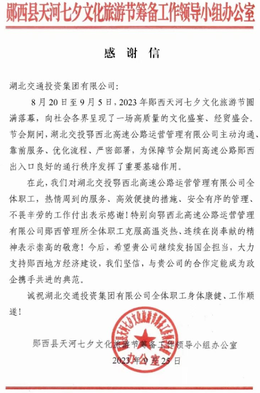 近日,湖北交投鄂西北運(yùn)營管理有限公司收到了十堰市鄖西縣政府發(fā)來的一封熱情洋溢的感謝信,字里行間流淌著濃濃的暖意。信中寫道:8月20日至9月5日,2023年鄖西天河七夕文化旅游節(jié)圓滿落幕,向社會各界呈現(xiàn)了一場高質(zhì)量的文化盛宴、經(jīng)貿(mào)盛會。節(jié)會期間,湖北交投鄂西北高速公路運(yùn)營管理有限公司主動溝通、靠前服務(wù)、優(yōu)化流程、嚴(yán)密部署,為保障節(jié)會期間高速公路鄖西出入口良好的通行秩序發(fā)揮了重要基礎(chǔ)作用。
