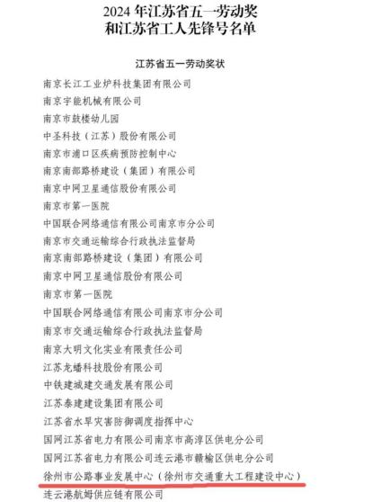 近日,江蘇省總工會(huì)發(fā)布《關(guān)于表彰2024年省五一勞動(dòng)獎(jiǎng)和省工人先鋒號(hào)的決定》,徐州市公路事業(yè)發(fā)展中心榮獲“江蘇省五一勞動(dòng)獎(jiǎng)狀”。