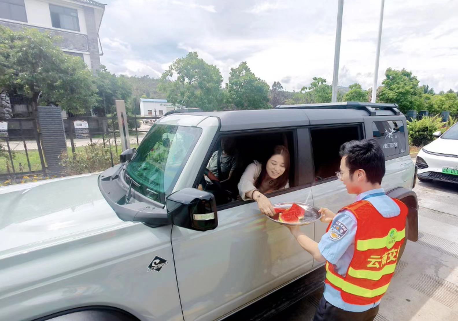 云南交投大理管理處洱源收費(fèi)站每當(dāng)陣雨過后,天氣都異常悶熱。近日,收費(fèi)站的員工們將站上買來的西瓜、哈密瓜等水果分享給過往司乘人員,讓他們在旅途中享受清涼,消除困乏。
