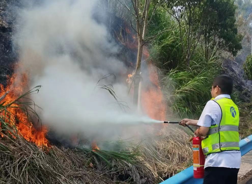 巡查員立即啟動有關(guān)應(yīng)急預(yù)案程序,撥打火警電話通知消防部門和杭瑞路段集中監(jiān)控點,并通過與通山收費站的積極協(xié)調(diào),借用了通山收費站口備用滅火器、調(diào)用了管理所水車,隨即巡查員化身“消防員”,第一時間沖向火場。他們猶如一群無畏的勇士,面對熊熊大火和滾滾濃煙,沒有絲毫退縮。他們熟練地操作著滅火設(shè)備,有的拿著滅火器,精準(zhǔn)地對著火源根部噴射;有的則端起消防水槍,噴向一仗多高的火焰。在滅火過程中,大家分工明確、配合默契,經(jīng)過他們的不懈努力,火勢終于得到了有效控制,保護(hù)了臨近天橋和光纜。將一場火災(zāi)消滅在萌芽之中,保障了人民的生命財產(chǎn)安全。
