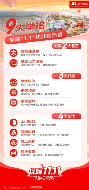針對今年11.11,京東物流重磅推出九大舉措,不僅進一步夯實智能新基建和多種運力兩大“基石”,還在時效、技術、國際物流、上門服務、商家運營、員工關懷、綠色低碳等7個方面全方位升級迭代,充分發(fā)揮一體化供應鏈核心優(yōu)勢,助力多平臺商家平穩(wěn)運營、消費者體驗“又省心又快”。
