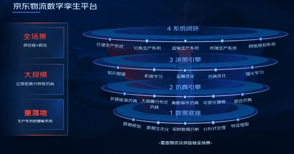 物流網(wǎng)絡(luò)的變動(dòng)是“牽一發(fā)而動(dòng)全身”的決策,決策的效果直接影響運(yùn)營(yíng)執(zhí)行的效率。數(shù)字孿生技術(shù)憑借其將物理與虛擬環(huán)境相融合的特性,成為了京東物流超腦系統(tǒng)實(shí)現(xiàn)智能規(guī)劃的關(guān)鍵基石。作為保障供應(yīng)鏈網(wǎng)暢通有效的頂層設(shè)計(jì),京東物流超腦融合數(shù)字孿生技術(shù),將數(shù)據(jù)驅(qū)動(dòng)的網(wǎng)絡(luò)規(guī)劃模型與仿真模擬相結(jié)合,實(shí)現(xiàn)倉(cāng)儲(chǔ)網(wǎng)絡(luò)、運(yùn)輸網(wǎng)絡(luò)、配送網(wǎng)絡(luò)的智能規(guī)劃,在平衡成本效率體驗(yàn)的基礎(chǔ)上驅(qū)動(dòng)供應(yīng)鏈全局最優(yōu)。