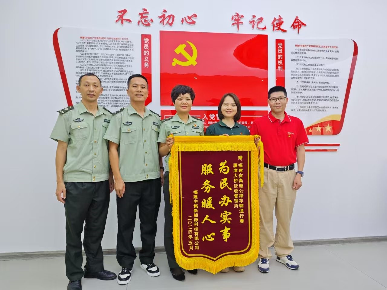 (圖為福建中集新能源科技有限公司高層管理人員為廈漳大橋征管所送“為民辦實事、服務(wù)暖人心”錦旗)