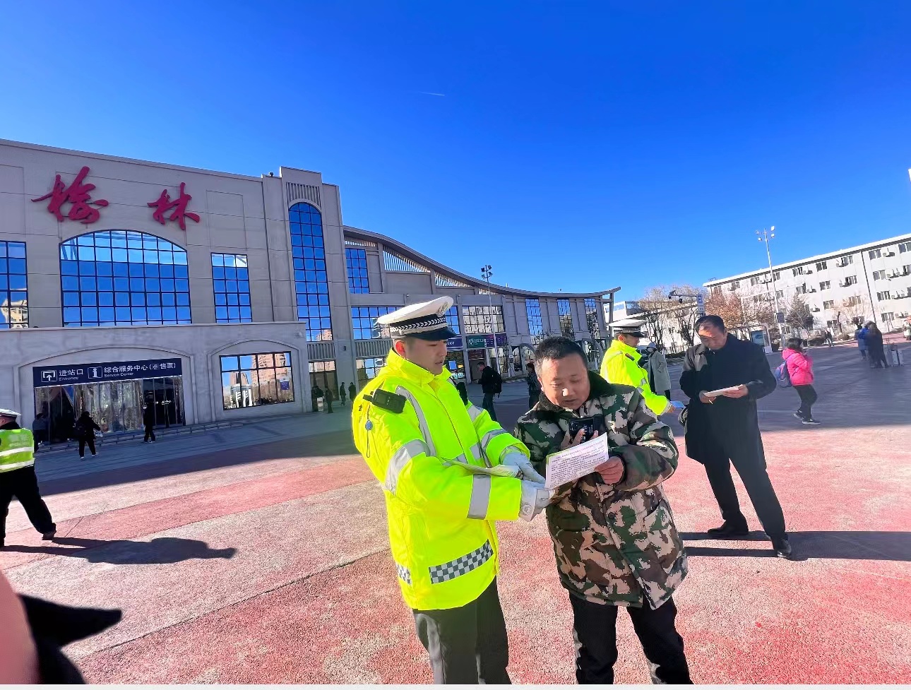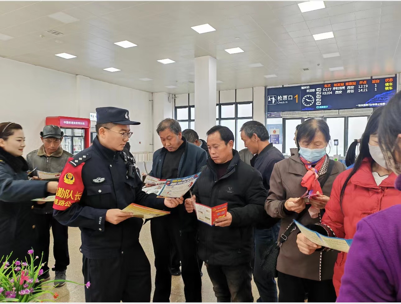 隨后,榆林所組織警力開(kāi)展春運(yùn)愛(ài)民實(shí)踐活動(dòng),在候車室設(shè)置“便民服務(wù)臺(tái)”、“法律咨詢”等區(qū)域,為旅客宣傳反電信詐騙知識(shí)、出行安全常識(shí)、發(fā)放宣傳單等。