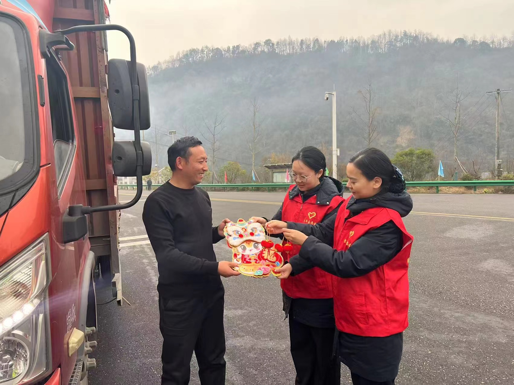 幾位身穿紅馬甲的志愿者站在收費廣場,面帶微笑地為過往的司乘人員贈送福字,送上節(jié)日的祝福。這一舉動不僅傳遞了節(jié)日的喜慶氛圍,更讓司機們感受到了來自社會的關(guān)愛和尊重。