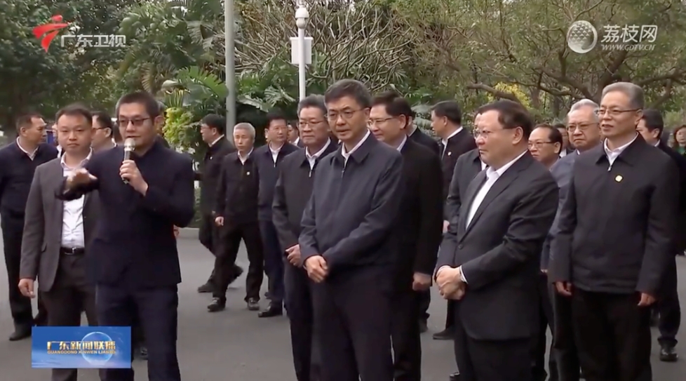 (廣西黨政代表團(tuán)視察文遠(yuǎn)知行。圖中前排左三為廣西壯族自治區(qū)黨委書記陳剛,前排左二為廣西壯族自治區(qū)黨委副書記、自治區(qū)主席藍(lán)天立,前排左四為廣東省委副書記、省長王偉中,前排左一為廣州市委書記郭永航。素材來源:廣東電視臺)