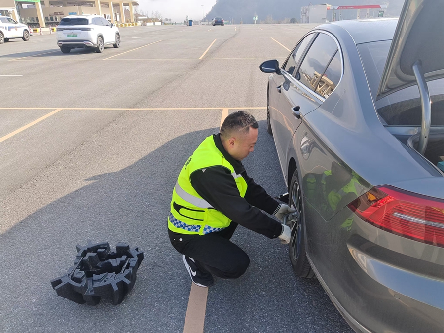 3月3日早,王先生駕駛小轎車從廣平高速唐家河收費(fèi)站駛?cè)敫咚,途中發(fā)現(xiàn)左后輪胎急速漏氣、車身出現(xiàn)搖晃、嚴(yán)重影響行駛安全;就近駛?cè)肭帻埡⻊?wù)區(qū),停車與維修店聯(lián)系維修事宜,因路途過遠(yuǎn)、價(jià)格過高發(fā)生爭(zhēng)執(zhí)。正在王先生急氣交加之際,巡查至此的何晶上前詢問,在了解情況、檢查故障后,一邊安撫王先生情緒,一邊取出清障車隨車工具,花費(fèi)20多分鐘時(shí)間卸下漏氣輪胎、換上備用輪胎。