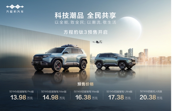 2025年3月31日,比亞迪個(gè)性化品牌方程豹旗下全新車型鈦3正式開啟預(yù)售,正式布局緊湊型SUV市場。鈦3定位科技潮品SUV,搭載其獨(dú)有的潮流配置“1機(jī)3艙”,以及“iCT”安全三件套、“E+2C”智能三件套,實(shí)現(xiàn)了科技越級(jí)、空間越級(jí)、配置越級(jí),以拉滿的產(chǎn)品價(jià)值滿足廣大消費(fèi)者多元化場景和生活需求,非常適合都市和家用,開創(chuàng)科技潮品新時(shí)代。比亞迪集團(tuán)方程豹汽車總經(jīng)理熊甜波現(xiàn)場公布了方程豹鈦3的5個(gè)版本及預(yù)售價(jià)格:501KM后驅(qū)智駕Pro版13.98萬元,501KM后驅(qū)智駕Max版14.98萬元,501KM四驅(qū)智駕Max版16.38萬元,501KM四驅(qū)智駕Ultra版17.38萬元,501KM四驅(qū)無人機(jī)版20.38萬元,超值的價(jià)格給予了廣大用戶極大的驚喜。