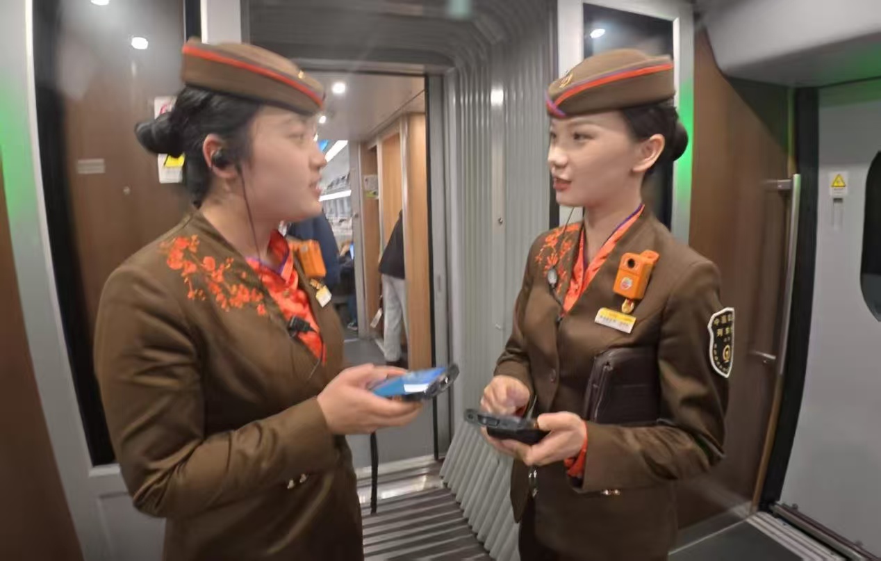 (武漢鐵路局武漢客運(yùn)段漢口城際動(dòng)車組車間C3組列車長(zhǎng)鄧子儀(右)在夜間行車中向乘務(wù)員了解工作時(shí)的情景)