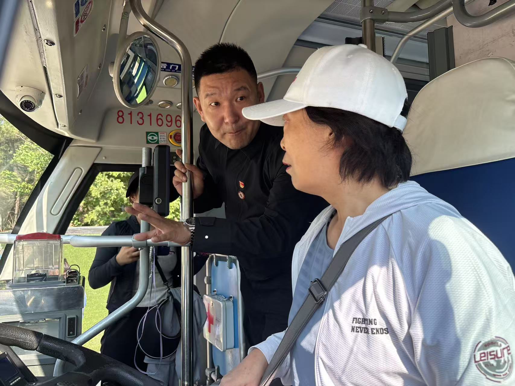 活動現(xiàn)場,車隊安服隊長楊云化身親切的“安全老師”,用童趣十足的語言開啟安全課堂:“小朋友們,等公交車時要像小松樹一樣站得直直的,可不能當(dāng)調(diào)皮的小猴子到處跑哦!”他一邊模擬站臺候車場景,一邊手把手教孩子們排隊上車、規(guī)范刷卡,生動演示“坐穩(wěn)扶好、不把頭手伸出窗外”的重要性。車廂內(nèi),孩子們好奇地撫摸座椅扶手,認真聆聽車輛行駛中的安全守則,清脆的童聲跟著楊隊長齊聲誦讀安全口訣,讓安全知識在歡聲笑語中入腦入心。
