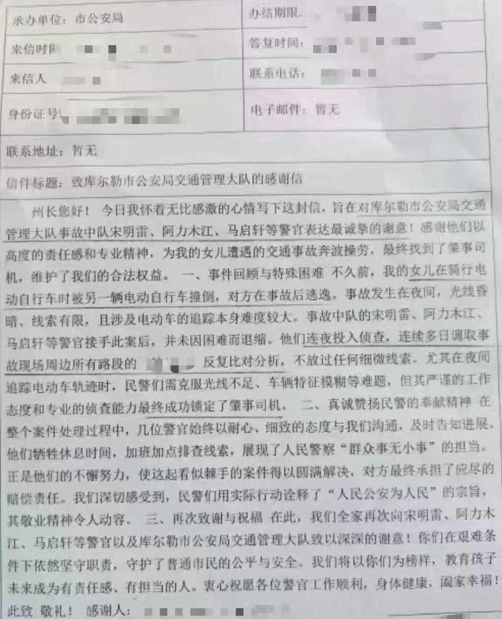 近日,新疆庫爾勒市民武女士庫爾勒市公安局寫的感謝信,字里行間滿是對庫爾勒市公安局交通管理大隊(duì)事故中隊(duì)辦案民警宋明雷、輔警阿力木江·庫爾班、馬啟軒的感激之情,他們連續(xù)奮戰(zhàn)三天,剝繭抽絲偵破了夜晚發(fā)生的交通事故肇事逃逸案,還為受傷的女兒追回2000多元的醫(yī)療費(fèi)。