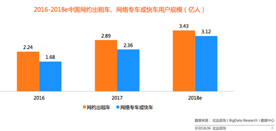 根據(jù)比達(dá)咨詢數(shù)據(jù)中心監(jiān)測(cè)數(shù)據(jù)顯示,截止2017年底,中國(guó)網(wǎng)約出租車(chē)用戶規(guī)模已達(dá)2.89億人,預(yù)計(jì)2018年達(dá)到3.43億人。在國(guó)內(nèi),網(wǎng)約車(chē)平臺(tái)運(yùn)營(yíng)模式多采用B2C與C2C相結(jié)合方式,目前網(wǎng)約車(chē)已經(jīng)成為共享出行市場(chǎng)的重要構(gòu)成部分,逐漸成為了國(guó)民出行的一種習(xí)慣,用戶規(guī)模必將持續(xù)而穩(wěn)定地增長(zhǎng)。