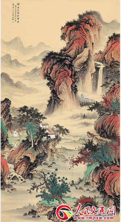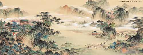 畫家在色彩的使用上也十分巧妙,筆法精妙獨(dú)特,注重線條的流暢感,渲染點(diǎn)綴恰到好處,使整個畫面高古大氣,使畫面呈現(xiàn)出恍若仙境的藝術(shù)氛圍,為觀賞者呈現(xiàn)出一幅山重水復(fù),意境悠遠(yuǎn)的藝術(shù)情境,令人回味無窮。