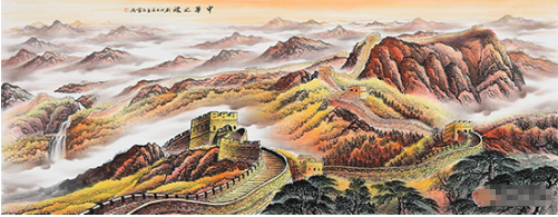 山水畫風(fēng)水學(xué)上,長城猶如一條巨龍昂首騰飛,此寓意事業(yè)騰飛向前、節(jié)節(jié)攀高;長城由近至遠(yuǎn)、蜿蜒向上,龍脈綿延千里,此寓意人生發(fā)展節(jié)節(jié)攀高;氣勢磅礴的萬里長城穿梭于云霧之中,象征事業(yè)風(fēng)生水起、一片錦繡。