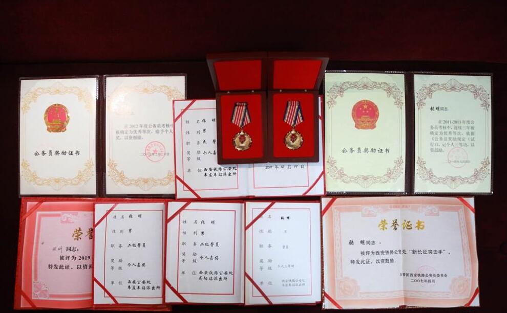 圖為張明同志參加工作以來的部分立功獲獎獎?wù)潞妥C書。