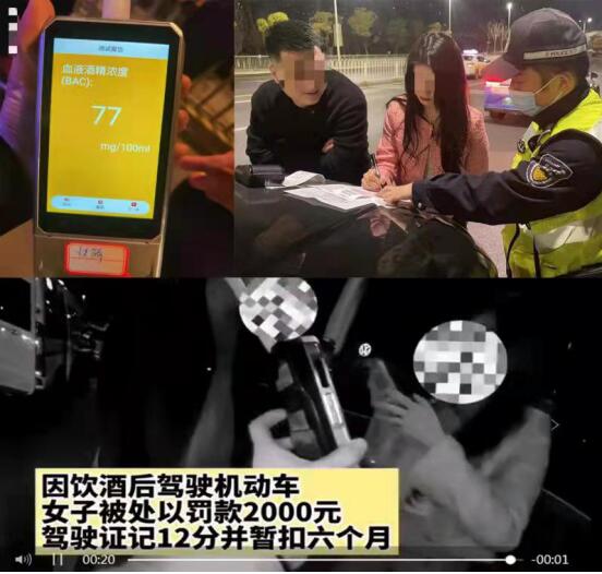車門打開后,一名女司機從駕駛室下來,經酒精快排檢測發(fā)現(xiàn)有酒駕嫌疑。面對交警詢問,女子表示剛才喝了一瓶啤酒,但自我感覺良好,也沒有頭暈。“酒駕不是以暈不暈來判斷的。”隨后,民警對女子進行呼氣式酒精檢測,結果顯示其體內酒精含量為77mg/100ml,達到飲酒后駕駛機動車標準。