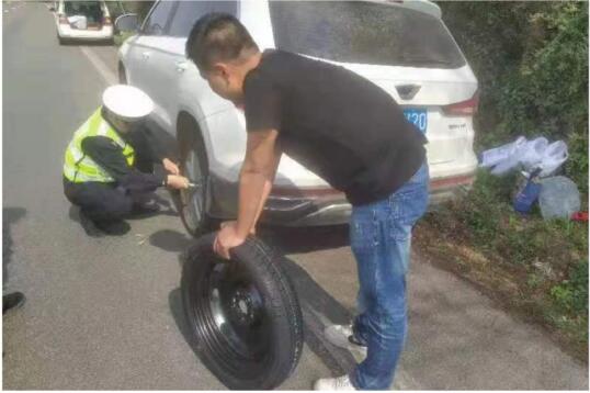 民警立即停車上前詢問,原來楊師傅當天駕車從龍陵出發(fā)準備前往昆明,不料車輛行駛至此路段時,輪胎因壓到釘子導致爆胎無法繼續(xù)行駛。楊師傅將車輛?吭诼愤,但自己一個人又不知道怎樣更換輪胎。