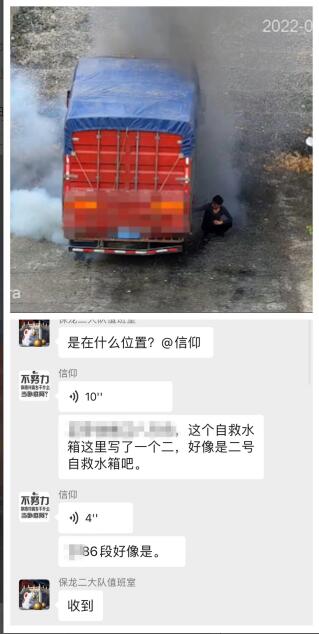 3月15日17時(shí)30分,微信名為“信仰”的卡車司機(jī)駕車在高速行駛時(shí),突然發(fā)現(xiàn)前方一輛紅色小貨車右后輪燃起了明火,但該車駕駛?cè)怂坪醪⑽床煊X,全然沒有減速跡象。發(fā)現(xiàn)險(xiǎn)情后,“信仰”司機(jī)師傅不斷鳴喇叭提醒該車駕駛?cè),并及時(shí)把車?吭诎踩范螌⒃撔畔l(fā)送到保山市公安局交警支隊(duì)建立的“暢行保山高速”警民微信群內(nèi)向民警報(bào)警,看到群消息后,保龍二大隊(duì)民警立即趕往現(xiàn)場(chǎng)處置。