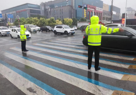 風(fēng)雨中,執(zhí)勤民輔警駐守在重點(diǎn)路口路段,指揮來(lái)往車輛有序通行,提醒來(lái)往駕駛?cè)藛T要謹(jǐn)慎駕駛,減速慢行,時(shí)刻注意路面交通情況,確保廣大群眾平安出行。同時(shí),加強(qiáng)路面巡邏管控力度,對(duì)轄區(qū)易積水路段以及橋隧、涵洞等易積水部位進(jìn)行全面排查。